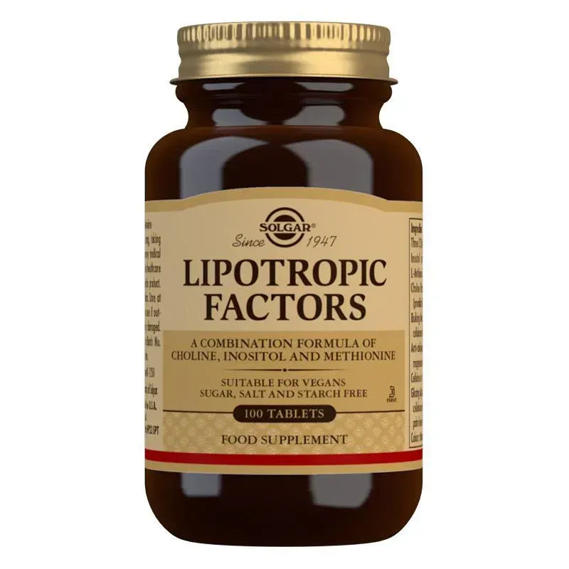 Solgar Lipotropic Factors is a combination formula of choline, inositol and L-methionine. Choline is a water-soluble micronutrient that contributes to the metabolism of fats (lipids). The transport of fats, both lipoproteins and triglycerides, from the liver to the body's cells requires choline and is also necessary to prevent the accumulation of fat in the liver.